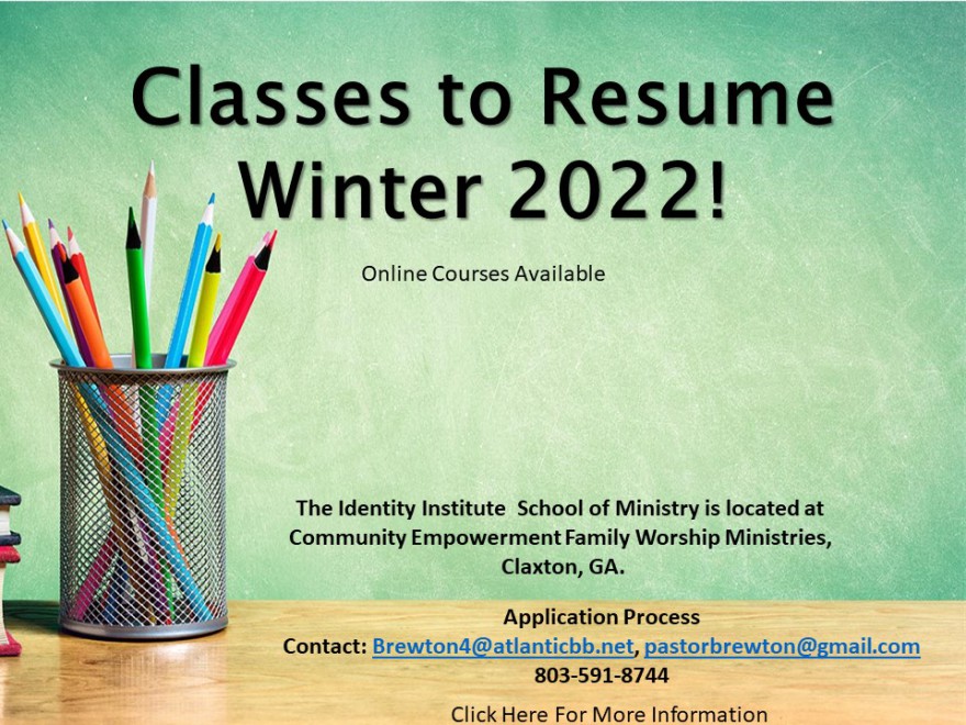 Located in Claxton, GA The Identity Institute is committed to its purpose to awaken the true identity of its students by developing them for their kingdom assignment by providing progressive revelatory leadership that will teach and train them in Biblical Studies, Kingdom level leadership, and prophetic training.